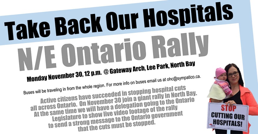 Active citizens have succeeded in stopping cuts all across Ontario. On November 30 join a giant rally in North Bay. At the same time we will have a delegation going to the Ontario Legislature to show live video footage of the rally to send a strong message to the Ontario government that the cuts must be stopped.